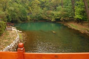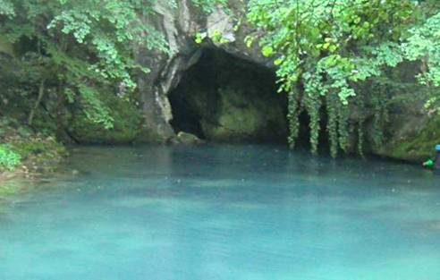 Diese Höhle ist etwas kleiner als die 1. Location, ebenso sind die Dimensionen des Baches darunter kleiner. Auf jeden Fall lohnenswert, sich diese Höhle einmal genauer anzusehen, angeblich bis 123m betaucht. Der Zugang zum Pool geht über schmale Pfade an den Becken einer Forellenzucht vorbei. Direkt vor dem Restaurant gibt es eine Thermalquelle, die in einen Pool läuft. Es kann/soll gebadet werden.