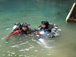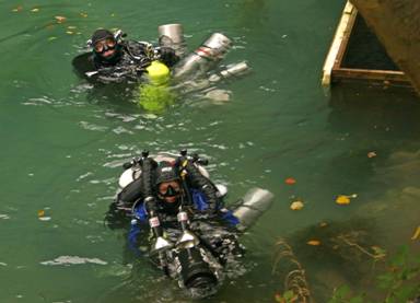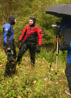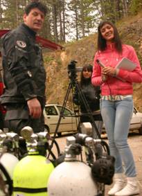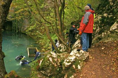 Wir tauchten in verschiedenen Teams und versuchten den Eingang in die eigentliche Höhle zu finden bei anfänglich 0,5m-1m Sichtweiten. Im Laufe des Tages wurde die Sicht weiter schlechter. Die Dimensionen auf der Infotafel irritieren ein wenig und vermittelten große Räume. Das war aber nicht der Fall, der Untergrund bestand aus lockerem Schlick mit losen Steinen und Ästen, die Wände des Trichters aus bröseligem Gestein. Dieser Tauchtag war insgesamt nicht ganz so erfolgreich wie erhofft. Das Drumherum dafür umso unterhaltsamer. Oliver FP war die ganze Zeit mit der Videokamera unterwegs und versuchte die ersten Impressionen unserer Tour einzufangen. Ein 2. Video Team, vom Serbischen Lokalfernsehen, machte ihm deutliche Konkurrenz.