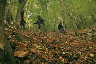 Die 2. Position befand sich am Rande des Waldes, auf einer Wiese am Fuße eines Berges. Dort befand sich ein Tümpel, aus dem im Frühjahr so viel Wasser strömt, dass die ganze Wiese weiträumig überschwemmt ist. Klingt nach einer möglichen Höhle oder aber nach vielen kleinen Hangquellen aus denen im Frühjahr viel Wasser fließt. Es fanden sich 2 Freiwillige, die in die Anzüge schlüpften und mal den Boden absuchen. Leider war nichts von einem Höhleneingang zu finden. Nebenher wurde immer ein bisschen gefilmt.