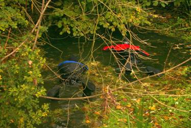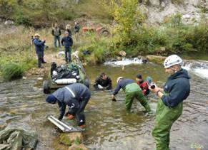 In der Zwischenzeit wartete ein Traktor in der Mitte des Baches, um unser Tauchzeug zu den Autos zu bringen. Vorher musste das lehmige Equipment aber noch im Bach gereinigt werden.