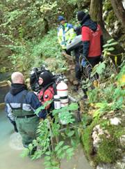 Team 1 sollte die Bedingungen an der Höhle vom Vortag checken. Die Sicht hatte sich innerhalb eines Tages von 0 auf 1m verbessert. In der Nähe gab es einen weiteren „heißen Tipp“. Dieser Information wurde ebenfalls nachgegangen, war aber leider uninteressant (Unterspülung / Steilwand im Fluss).
