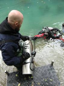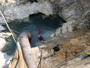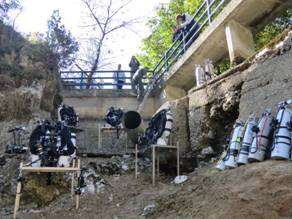 In der unterzeichneten Absichtserklärung bekundete die Stadt Nis ihr Interesse daran, dass wir in der Wasserversorgung von Nis tauchen. Dabei sollten wir Video / Fotomaterial der Pumpanlagen und Wasserproben aus den einzelnen Tiefen sammeln. Als wir an der Wasserversorgung ankamen stellten wir mit entsetzten fest, dass der Wasserstand ca. 10m tiefer war als bei unserem letzten Besuch. Nach einigem Überlegen beschlossen wir trotzdem einen Versuch zu unternehmen. Mit Leitern und Seilen ermöglichten wir den Zugang und sicherten das Gelände. Hinter Elektrozaun und von bewaffneten Sicherheitsleuten umgeben bauten wir unsere Tauchgeräte zusammen. Der Bürgermeister und der Chef der Wasserversorgung statteten uns ebenfalls einen Besuch ab und sahen sich das geschäftige Treiben interessiert an.