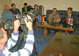 Einige bekannte Gesichter von unserem letzten Besuch befanden sich unter den Gästen wir wurden auf das herzlichste begrüsst. Es folgte Händeschütteln, Snacks und Slibo. Hauptgegenstand dieses Empfangs war die Unterzeichnung einer Absichtserklärung über die längere gemeinsame Zusammenarbeit. Auf dem Tisch waren die einzelnen Fahnen platziert: EU, Deutschland, Serbien und die der Stadt Nis. Verträge in Ledermappen, Unterschreiben, Austausch, Überreichen, Händeschütteln, Blitzlichtgewitter und Fernsehkameras. Danach wurde eine Presseerklärung erwartet. Anschließend zeigte uns der Bürgermeister fantastische Bilder einer 6km langen Trockenhöhle in der Nähe.