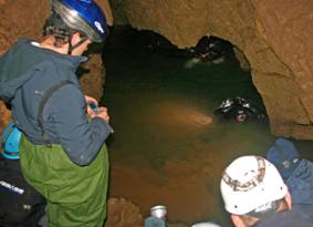 Wir beschlossen: Ein Team sollte (Oli und Ike) abtauchen und den Eingang unterwasser suchen, der Rest organisiert den Transfer Auto à Höhle. Danach sollte entschieden werden, ob weitere Teams tauchen können oder nicht. Das ganze wurde auf Video festgehalten. Leider trübte der Pool schnell komplett ein, der Lehm klebte überall und wurde uns zum Verhängnis. Oli und Ike fanden den Eingang, aber an weiteres tauchen war nicht zu denken. Ein weiterer Grund wiederzukommen.