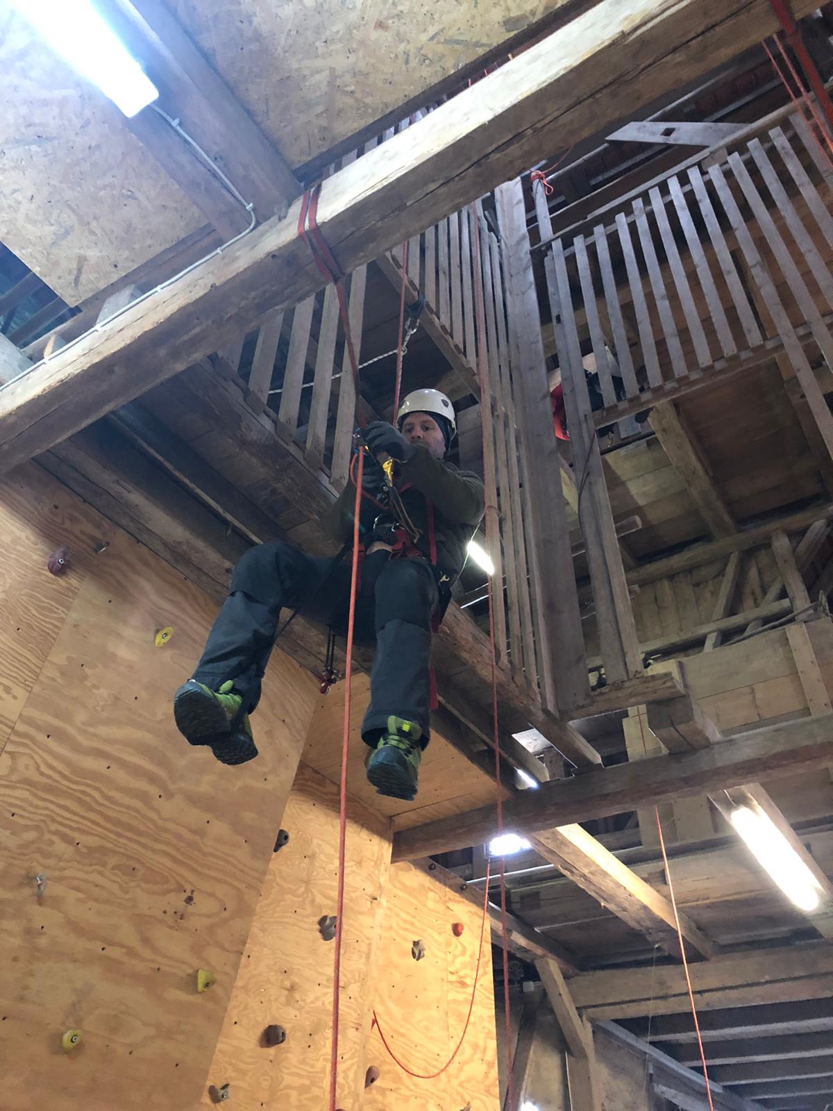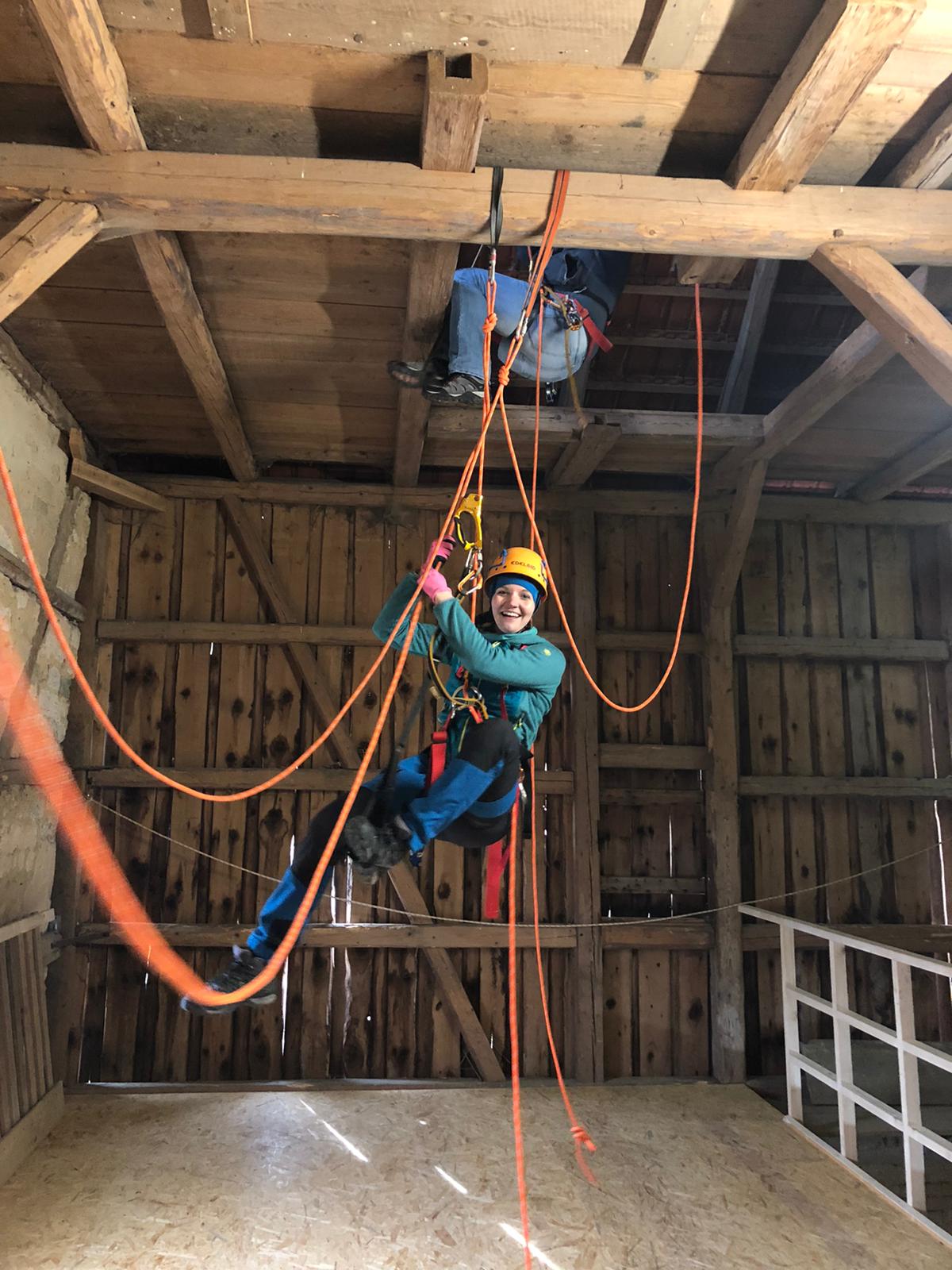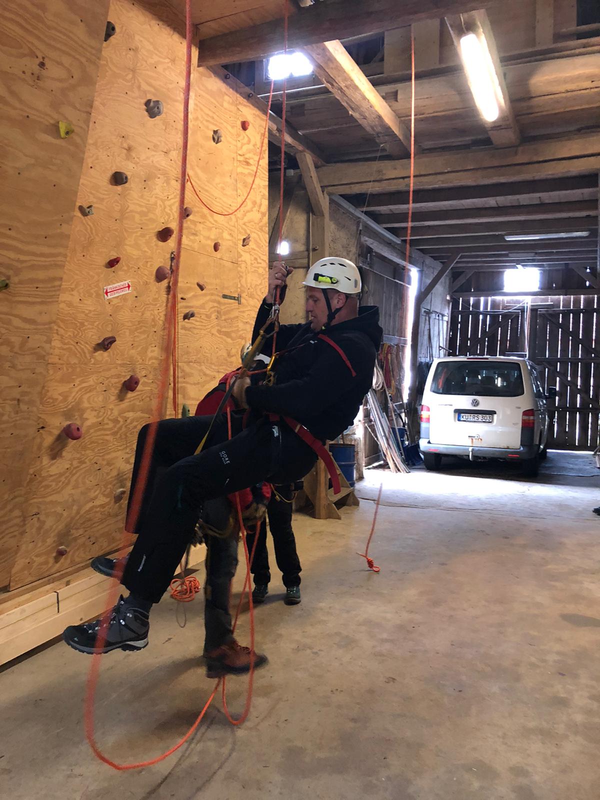 Bereits am Freitag Abend ist ein Teil des Teams angereist, neben einem leckeren Abendessen wurde schon am Abend viel gefachsimpelt. Am Samstag morgen kamen dann auch die letzten Teilnehmer an, sodass wir pünktlich gegen 9 Uhr starten konnten. Mit einer Mischung aus Theorie und Praxis haben uns Nils und Paul in die Thematik eingearbeitet, sodass wir am Abend bereits problemlos am Seil auf und absteigen konnten.