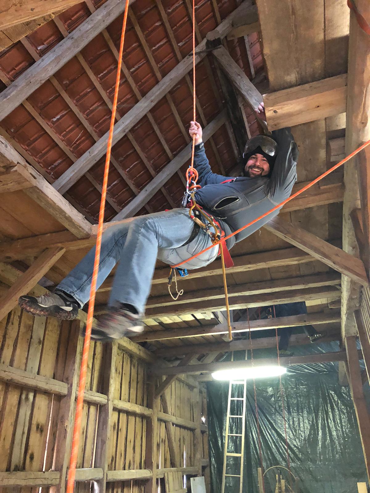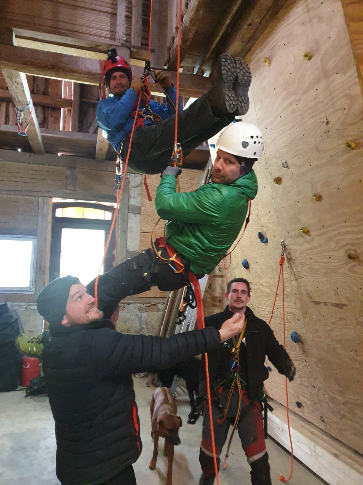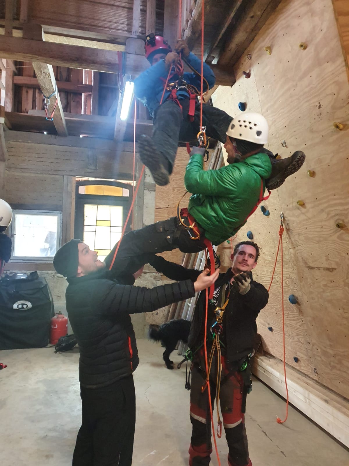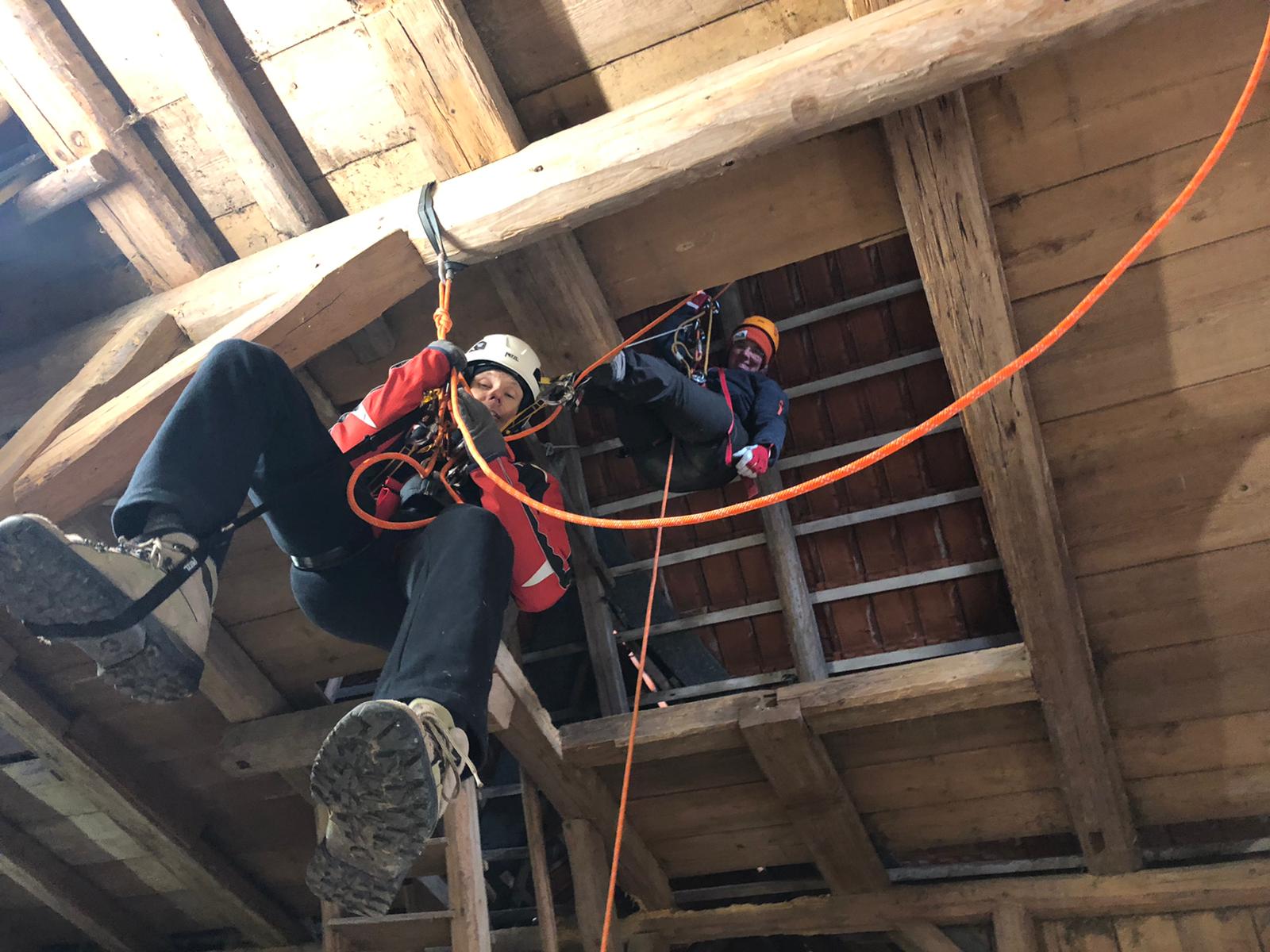 Bereits am Freitag Abend ist ein Teil des Teams angereist, neben einem leckeren Abendessen wurde schon am Abend viel gefachsimpelt. Am Samstag morgen kamen dann auch die letzten Teilnehmer an, sodass wir pünktlich gegen 9 Uhr starten konnten. Mit einer Mischung aus Theorie und Praxis haben uns Nils und Paul in die Thematik eingearbeitet, sodass wir am Abend bereits problemlos am Seil auf und absteigen konnten.