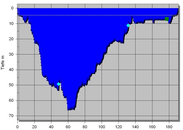 Profil unseres Tauchgangs durch den Deep Loop.Verwendete Gase im Rebreather: 15/55, 35/35, 50/25 und Sauerstoff.