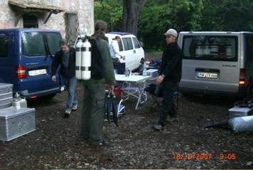 Zwischen dem 17. und 22. Oktober fuhren wir mit 6 Mann zur Gourneyras um unser neu angeschafftes Seilbahnequipment zu testen und ein paar TG durchzuführen. Im Gepäck waren insgesamt 6 Scooter, 3 RB80 mit D20, 3 D12 bis D20, Habitat und ca. 70 Stages. Aufgrund des Reisegepäcks waren wir mit 3 Autos unterwegs. Der Plan war das wir ca. um 18:00 Uhr an der Höhle aufschlagen und noch am selben Abend einen check TG mit D7 durchführen. Als wir an dem Feldweg der zur Gourneyras führt angekommen waren, war es leider schon ca. 20:00 Uhr. Für den Weg bis zur Höhle benötigten wir nochmals eine knappe Stunde. Der Weg war teilweise stark ausgespült so dass wir den Weg des Öfteren präparieren mussten. Auf