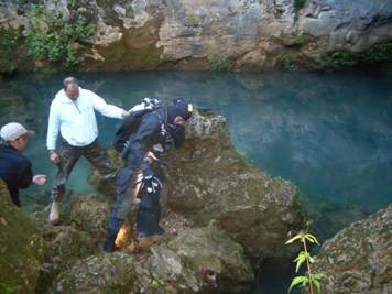 Robin, Markus und Stefan schätzten die Sicht bei ca. 12m und null Flow ein. Somit waren das zwar nicht die allerbesten Bedingungen für die Höhle, aber gut genug für unser Vorhaben am nächsten Tag. Nach dem erfolgreichen Check-Tauchgang, fuhren wir zu unserer Unterkunft Domaine de Geyfie bei Cajarc zurück. Am folgenden Tag wurde die St. Sauveur betaucht.