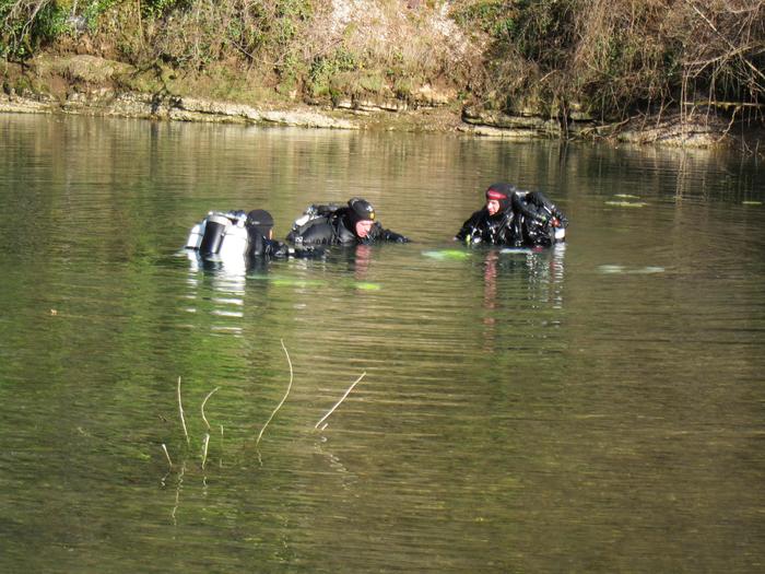 Wir, Anke und Benjamin, frische C 1, treffen all samstäglich Manuel Fiore und Tobi Ziegler am Starnberger See; zum Tauchen, Essen und ausgedehnten Ratschen. Fasziniert von ihren Erzählungen und der Art, wie herzlich sie mit uns umgingen, entstand bei uns ein überaus positives Bild der Cavebase, das sich beim Treffen anderer Mitglieder, z.B. am Bodensee und in Kiel absolut bestätigte. Daher haben wir die Aktivitäten der Cavebase immer mit großem Interesse verfolgt. Als dann Tobi Ziegler und Manuel Fiore uns von einem geplanten Projekt an der Ressel erzählten und uns fragten, ob wir mitfahren möchten, gab es für uns selbstverständlich kein Halten mehr.