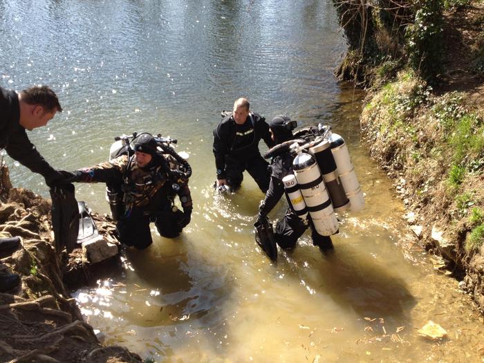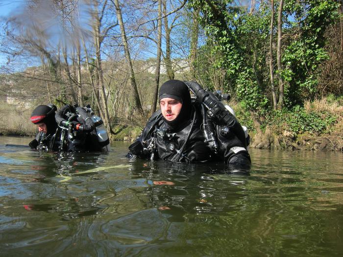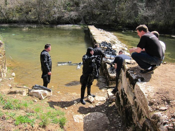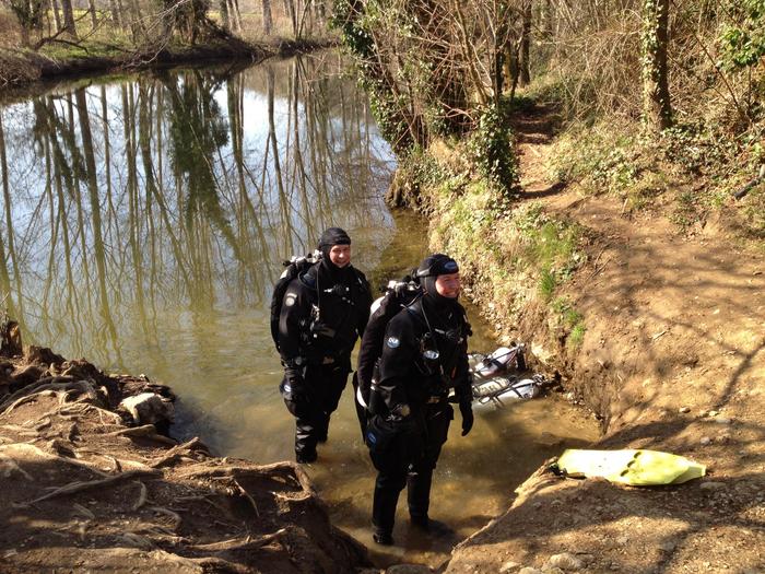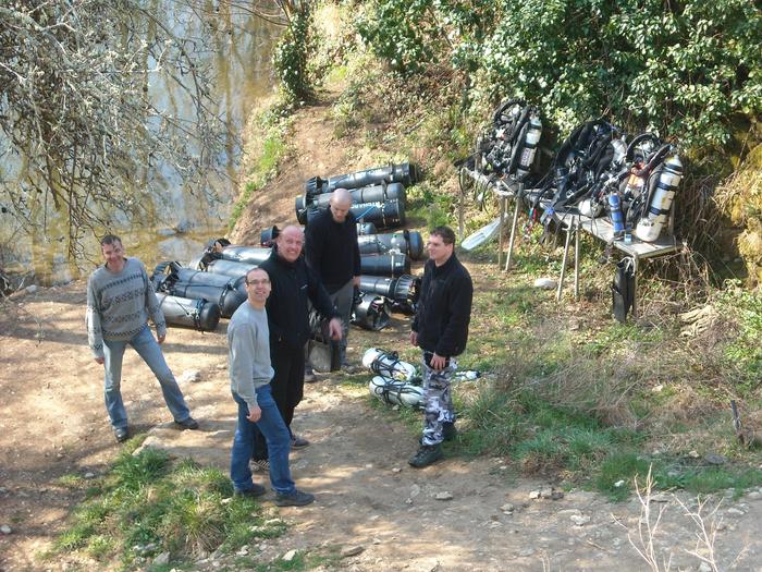 Dort angekommen, ging der Sport los. Eine beeindruckende Menge an Tauchgerät wurde an die Célé gebracht.  Wir machten uns tauchfertig und nahmen die Stages in der Célé in der Höhe des Höhleneingangs in Empfang, bündelten sie pro Taucher in einer Leash und befestigten sie an einem quer gespannten Seil. Zum Schluss kamen die O2-Stages - beeindruckend, wie schwer die sein können. Wir entschieden uns, sie in zwei Fuhren hinter den Versturz zu bringen, was mangels Übung ziemlich lange dauerte, uns aber gelang. Daher hatten wir das Glück beim Raustauchen Tobi und Carsten im Eingangsbereich zu sehen. Wir hatten noch Gas übrig und so blieben wir in der Höhle und beobachteten das Spektakel. Sie nahmen alle Stages und Scooter auf und schwebten groß wie Lastwagen im Eingangsbereich. Es dauerte nicht lang und sie fuhren los, alles Equipment schob sich automatisch an die richtige Stelle und so zogen sie an uns vorbei in die Höhle. Sehr schön!
