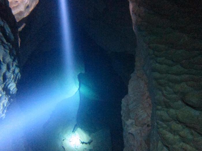 Bewaffnet mit Unmengen an Snoopyloops und Pfeilen waren die beiden für das fixieren der neuen Leine zuständig. Beide legten ihr Equipment an und tauchten in der Cele ab. Markus und Börni planten ebenfalls einen ca. 8 stündigen Tauchgang. Auf dem Reinweg passierten sie, wie auch Carsten und Tobi, zunächst das O2-Depot und konnten sich von der guten Arbeit der Supportteams überzeugen. Nach dem Wechsel auf das 35/35 ging die Fahrt weiter bis sie auf ca. 21 m vor dem Schacht ihr 50/25 plus Bailout ablegten. Am Depot 2 nahmen sie ihr 15/55 auf und legten das 35/35 ab. Am Depot 3 (3.T) links abgebogen begannen sie mit ihrer Arbeit. 6h nach Abtauchen von Tobi und Carsten begannen Marc und Andi wie besprochen mit dem ersten Support- / Checktauchgang. Die beiden waren so motiviert das sie in den folgenden 2 Stunden gefühlte 10 mal zwischen Einstieg und O2-Depot hin und her scooterten und eigentlich das gesamte nicht mehr benötigte Equipment aller 3 Teams herausholten! An dieser Stelle nochmals vielen Dank für den Einsatz und unser aller Respekt!!!