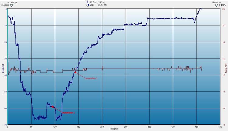 Die Deko verlief unspektakulär und sie tauchten nach ca. 235 min in der Cele auf. Alle drei grinsten noch lange nach dem Tauchgang über beide Ohren.